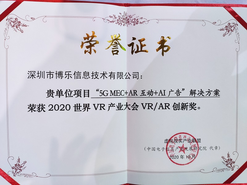 据调查显示,高达61%的人表示AR影响了他们的消费决定,78%的人对AR广告中的应用感到乐观,54%的人表示在部署过AR广告的互动中,用户参与度都达到满意。AR正在重新定义广告互动形式。博乐信息“5GMEC +AR广告”方案采用端+边+云一体化方案,通过AR摄像头上传数据流,MEC上AR应用合成渲染完后,以视频流下发到大屏TV端,为大屏端精准配置适合的AR互动内容及本地化、实时化的互动广告信息。目前本方案已在深圳机场党群服务中心部署落地,并获得华为开发者大赛ISV组2等奖、2020世界VR产业大会年度创新奖。