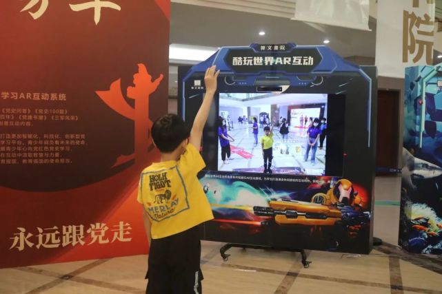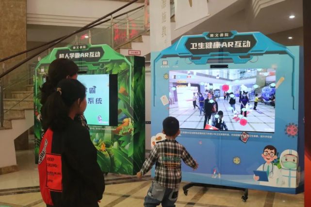 此次校园参观中最受瞩目的莫过于位于展示区“中心位”的AR数字互动体验区,该体验区由博乐信息的智慧党建、超人学霸、卫生健康、科普教育、酷玩世界、数字非遗6款AR互动系统以及数字AR动物园组成。