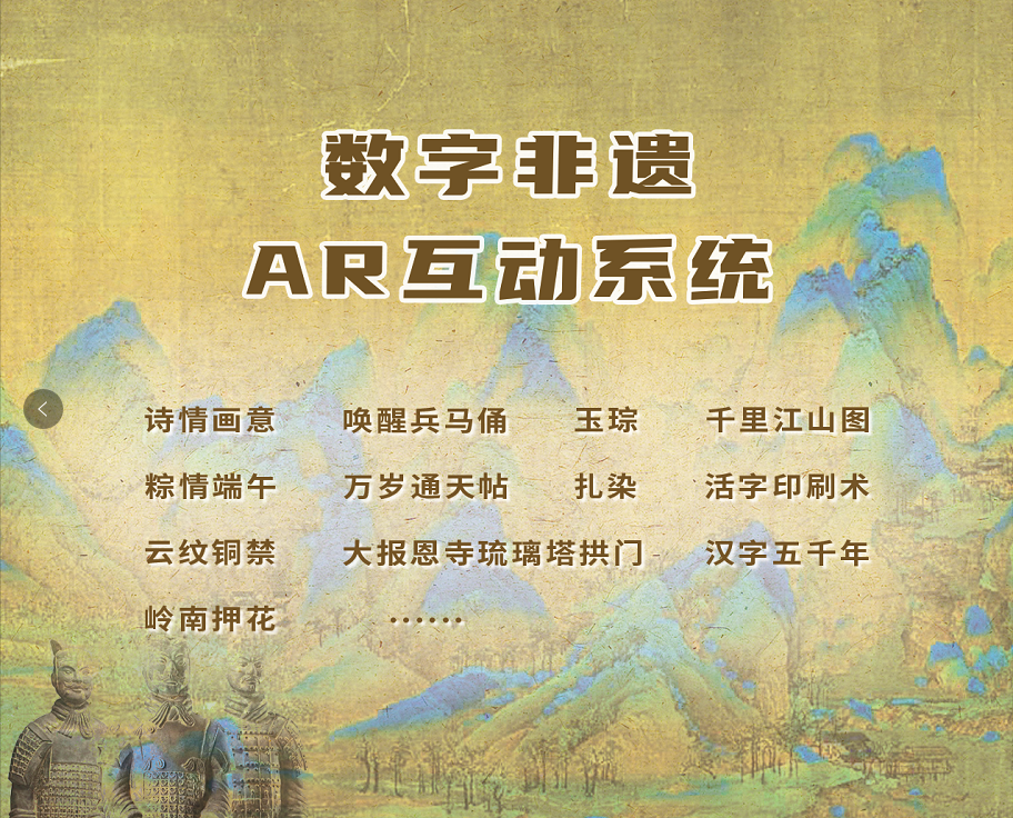 博乐信息《数字非遗》AR互动系统,融合AR增强现实、骨骼追踪、人脸识别等科技,创意研发12款AR互动内容,包括《千里江山图》《唤醒兵马俑》《大报恩寺琉璃塔拱门》等,以数字科技栩栩如生的展现每一个文化遗产背后的历史故事,穿越千年而来,打造永不褪色的“数字文化遗产”。
