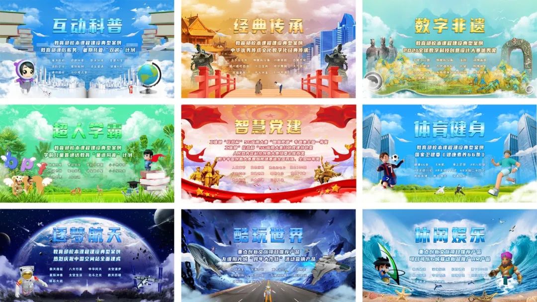 打造了集“互动科普、经典传承、数字非遗、智慧党建、数字卫健、逐梦航天、超人学霸、酷玩世界、休闲娱乐”等九大主题的AR大屏互动系统;