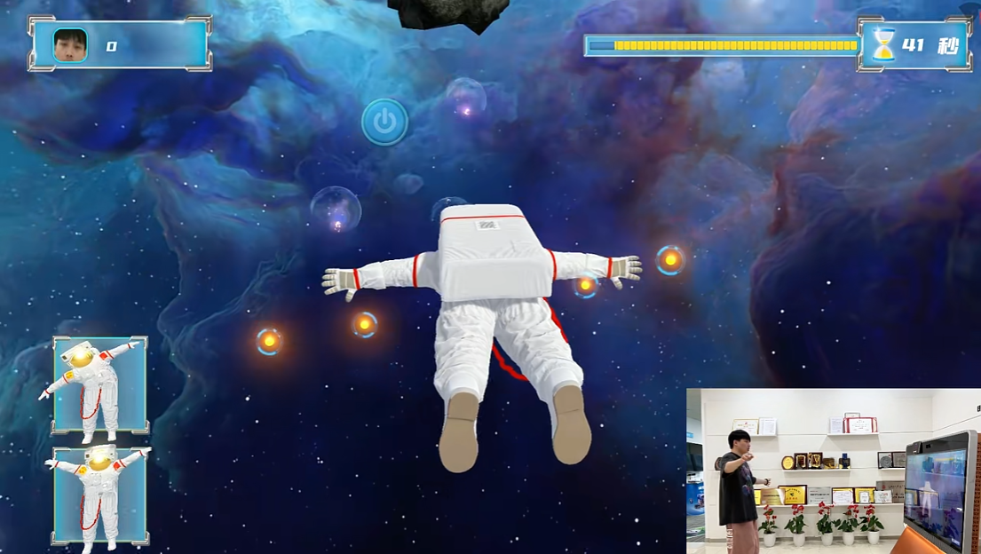 除此之外,博乐信息打造《逐梦航天》AR大屏互动系列产品同样精彩,体验者可以在屏幕前伸开双手,AR变身成为星际“航天员”,体验航天员“同款”太空漫步,了解北斗卫星、天宫系列、长征系列运载火箭等航天重器。